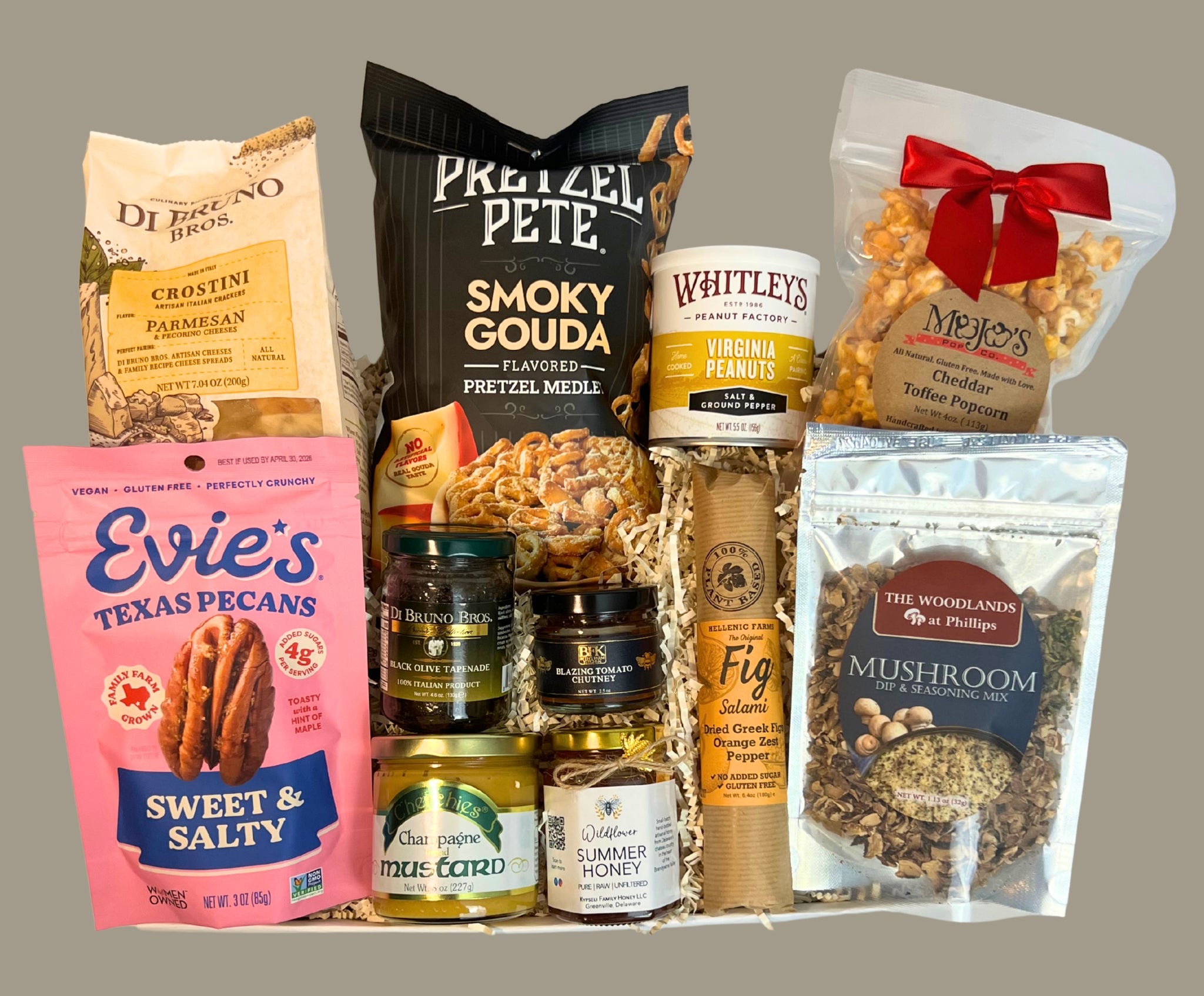Looking for the ultimate gift box to get the party started?! This grand gift box is filled with everything needed for a charcuterie spread that will impress, or as a gourmet snack box.